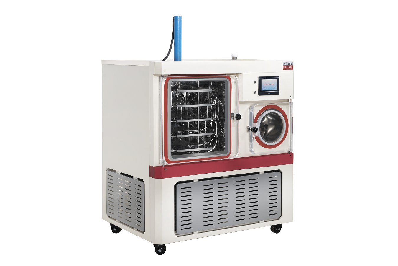 冷阱和(hé)幹燥室分體(tǐ)結構設計(jì),捕水(shuǐ)能力強,幹燥時(shí)間(jiān)短(duǎn);全不鏽鋼設計(jì),耐腐蝕易清潔,每層隔闆配備溫度傳感器(qì),可(kě)以監測每層物料的溫度及變化特性;
