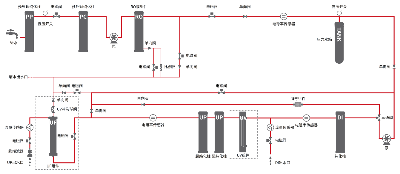 ■ RO水(shuǐ)不合格自動排放功能,确保進入後端純化組件的純水(shuǐ)質量。